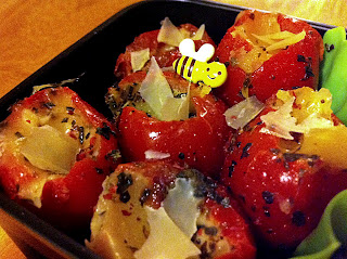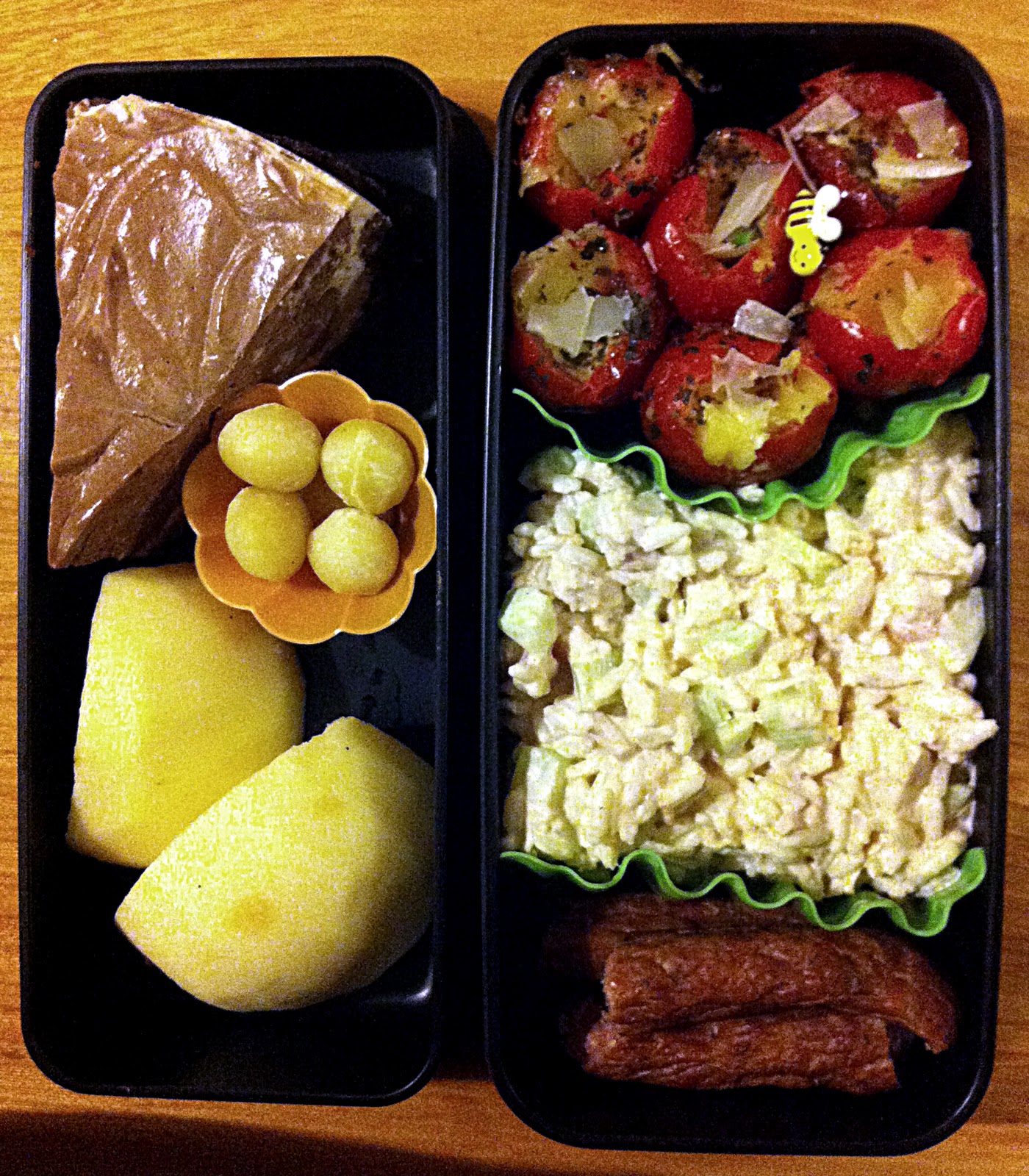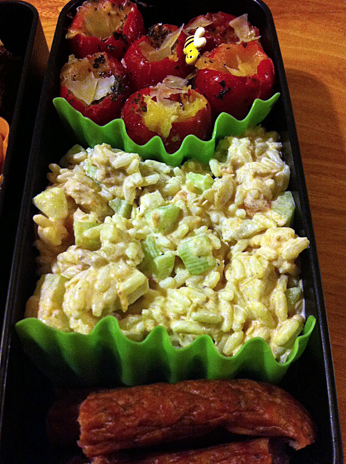 W dzisiejszym bento znalazła się sałatka ryżowa z indykiem, kabanosy i pyszne zapiekane, faszerowane mozzarellą pomidorki.