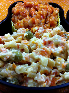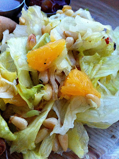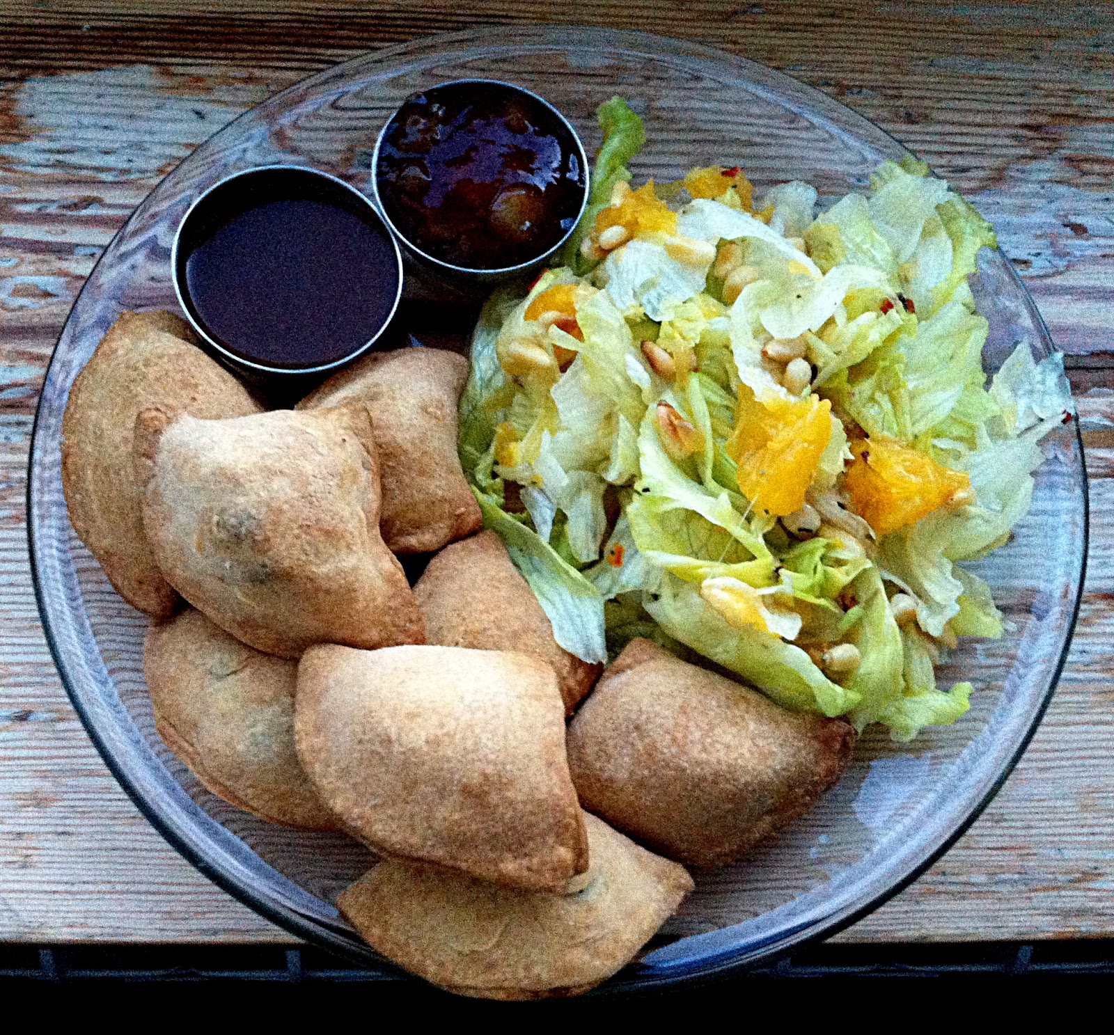 Ponownie pierożki samosa, tym razem w półkruchym cieście. Chyba jeszcze lepsze, niż poprzednio. Podane z sosem tamaryndowym, chutney'em z mango i sałatka z pomarańczą i orzeszkami piniowymi. Palce lizać!