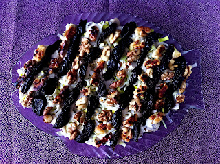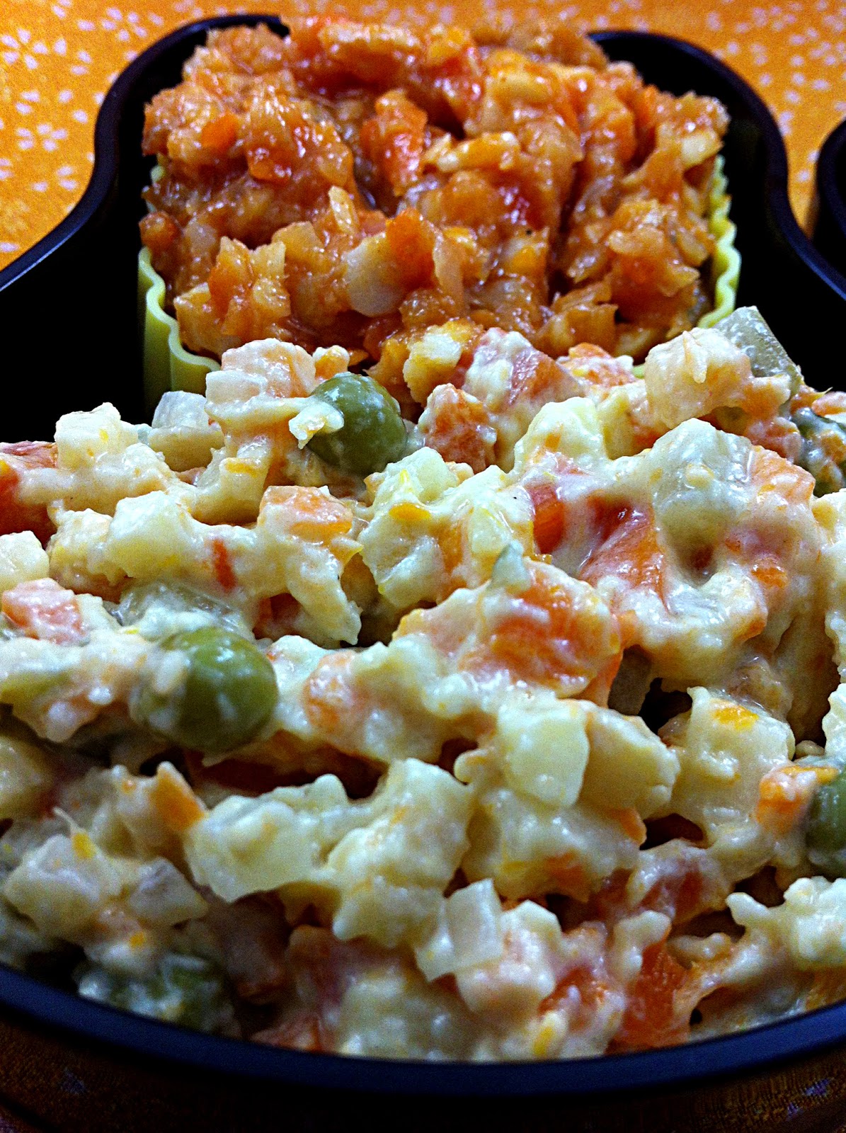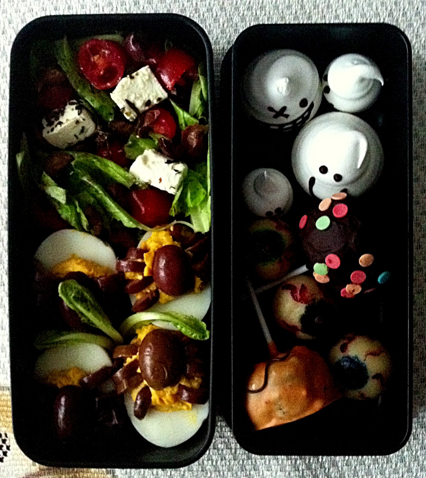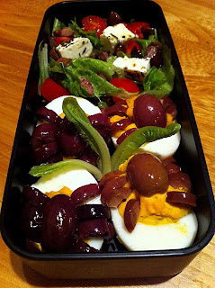 W dzisiejszym bento znalazły się śledzie z orzechami, porem i śliwką oraz sałatka z młodego szpinaku, suszonych pomidorów i orzechów włoskich z winegretem.