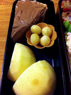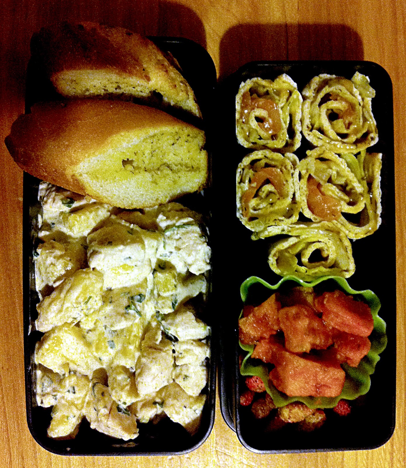 Składniki na sałatkę:W dzisiejszym bento sałatka z kurczaka i ananasa z bagietką czosnkową, roladki z chlebka polarnego, wędzonego łososia, sałaty lodowej i sosu do łososia (pomysł IKEA), pitahaja i poziomki.