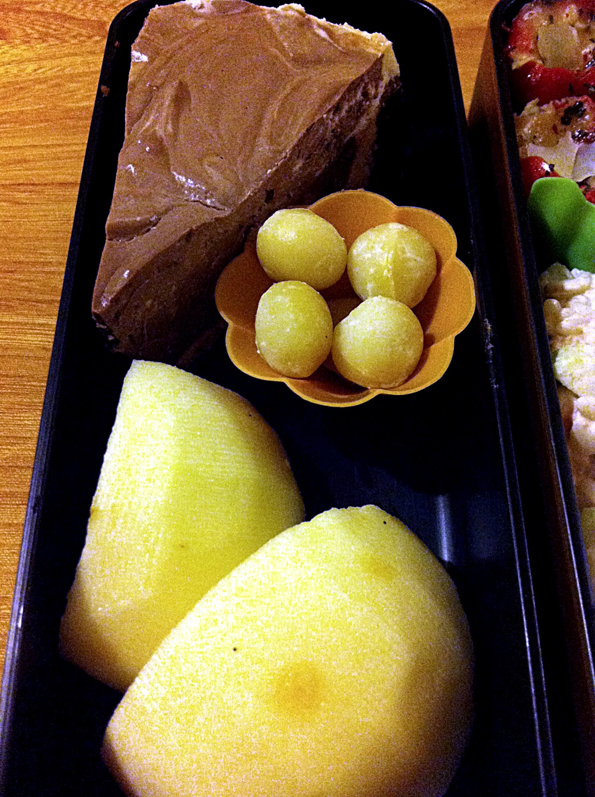 Na deser sernik czarno-biały, orzechy makadamia oraz jabłuszko.
