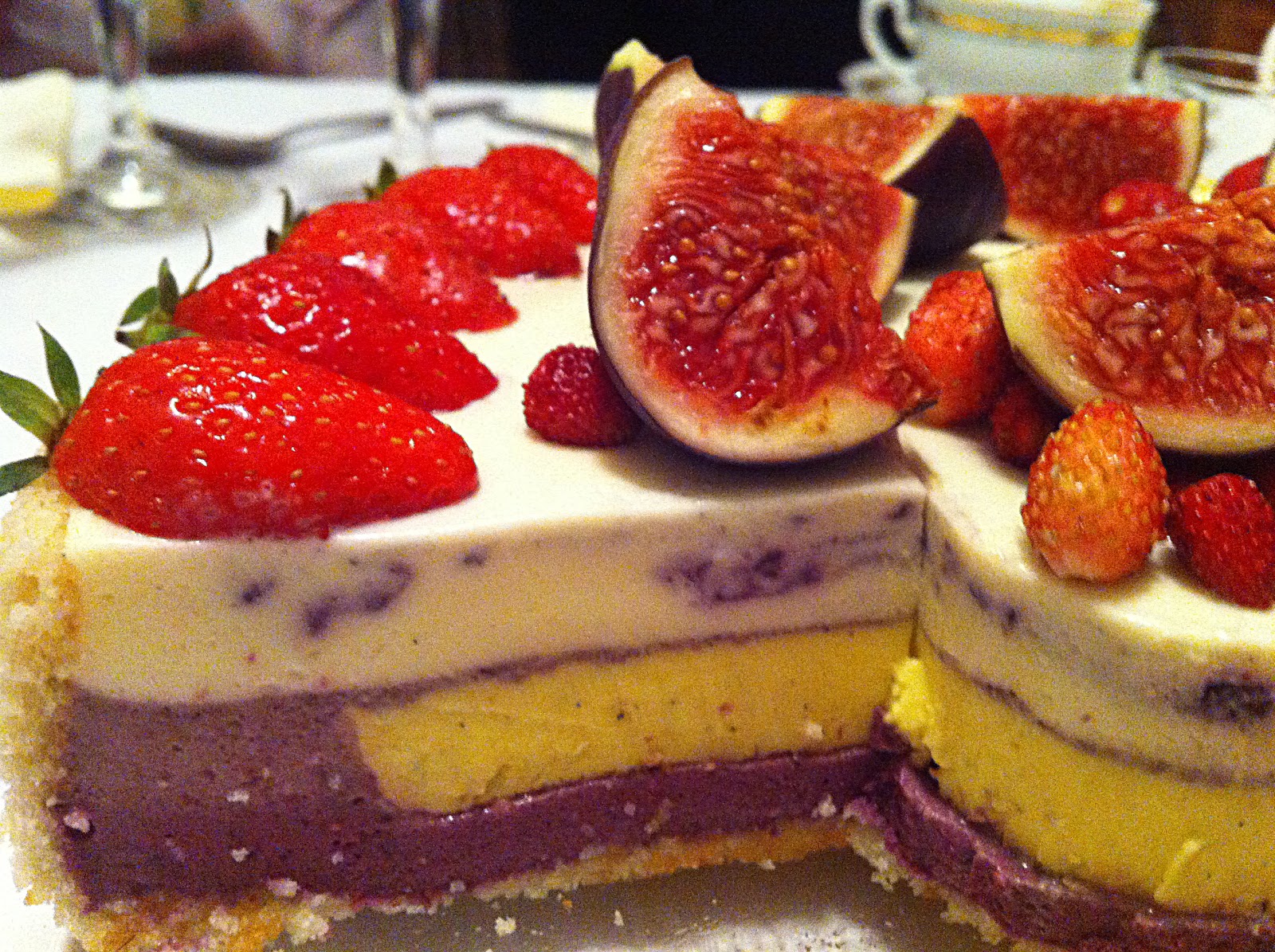 Tort z musem na bazie kremu bawarskiego z czarną porzeczką i malinami, warstwą musu z białej czekolady i crème brûlée na biszkopcie migdałowym. Pyszny!
