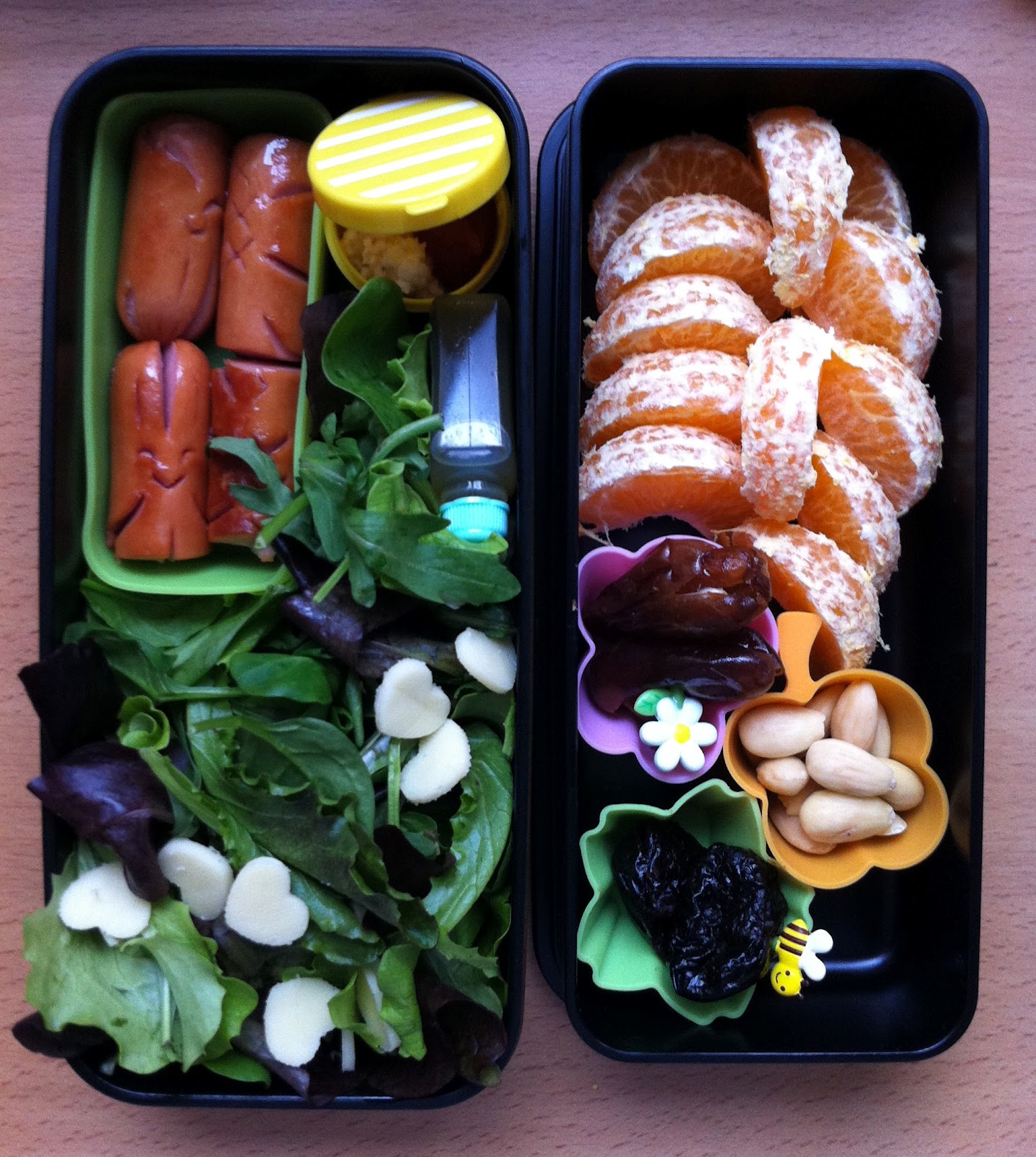 W moim pierwszym bento znalazły się paróweczki króliki i żółwie oraz mieszanka sałat z serduszkami z sera koziego wraz z winegretem z oleju z orzechów włoskich i octu balsamicznego. Na deser mandarynka, suszone daktyle i śliwki oraz garstka migdałów blanszowanych.