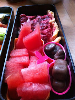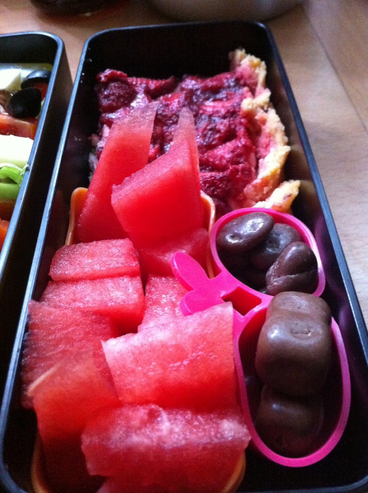 Deserowo: tarta z truskawkami i lemon curd (już trochę straciła blask), arbuz i rodzynki w czekoladzie.