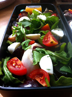 Dzisiejsze bento składa się z mieszanki sałat z pomidorkami koktajlowymi, mozzarellą z bazylią, wędzoną piersią kurczaka i różowymi winogronami z dressingiem mango&chilli.