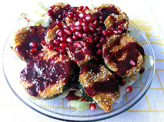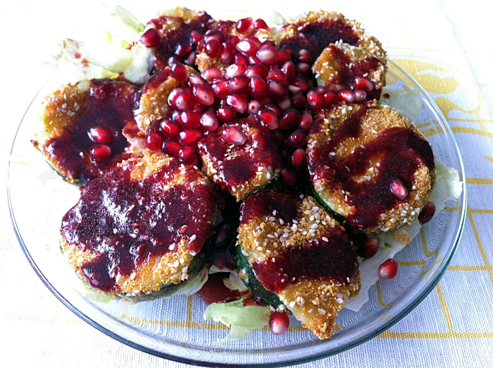Na półmisek wykładamy porwane liście sałaty i upieczoną cukinię. Całość polewamy dressingiem porzeczkowym, a wierzch posypujemy pestkami owocu granatu.