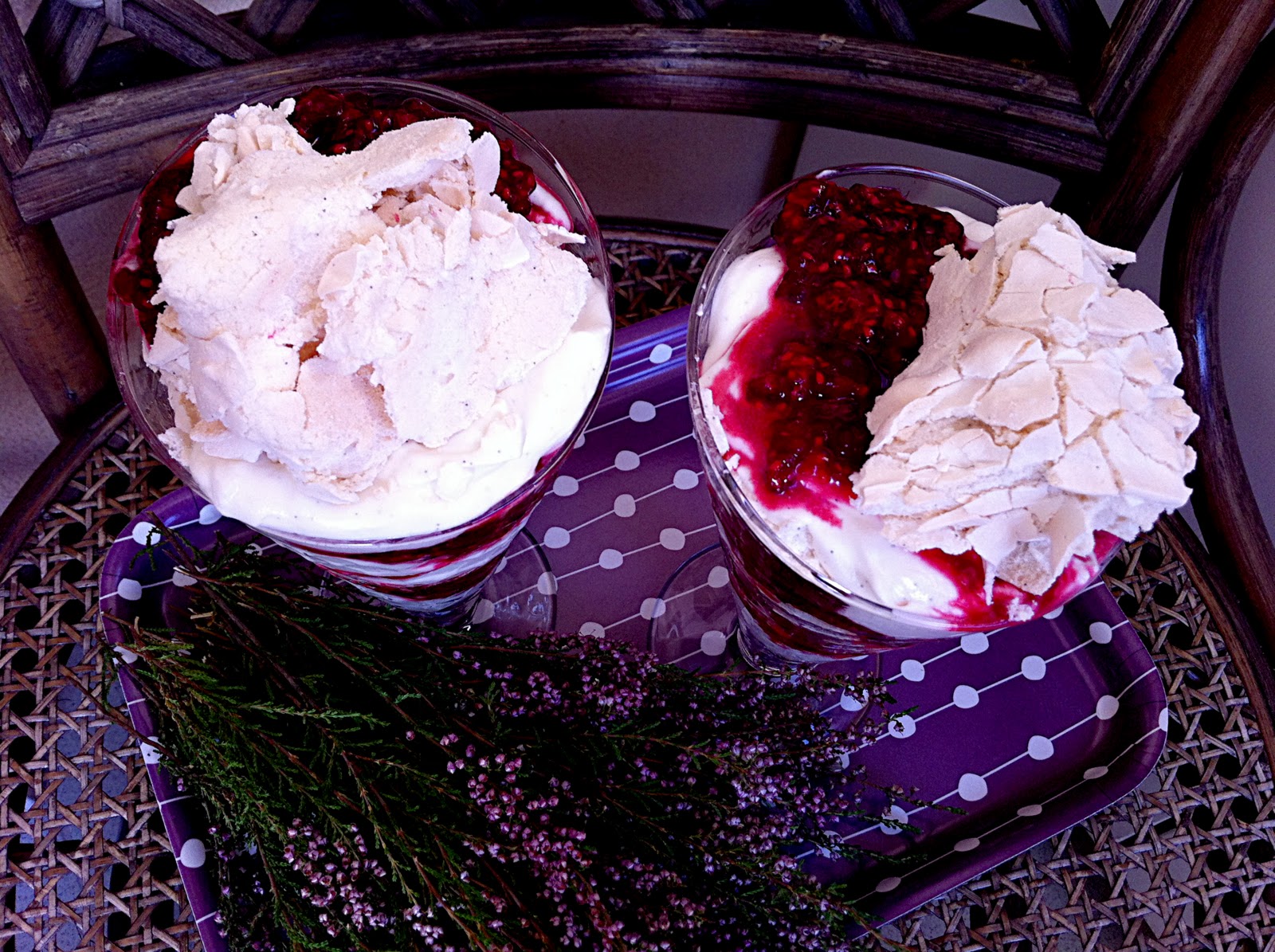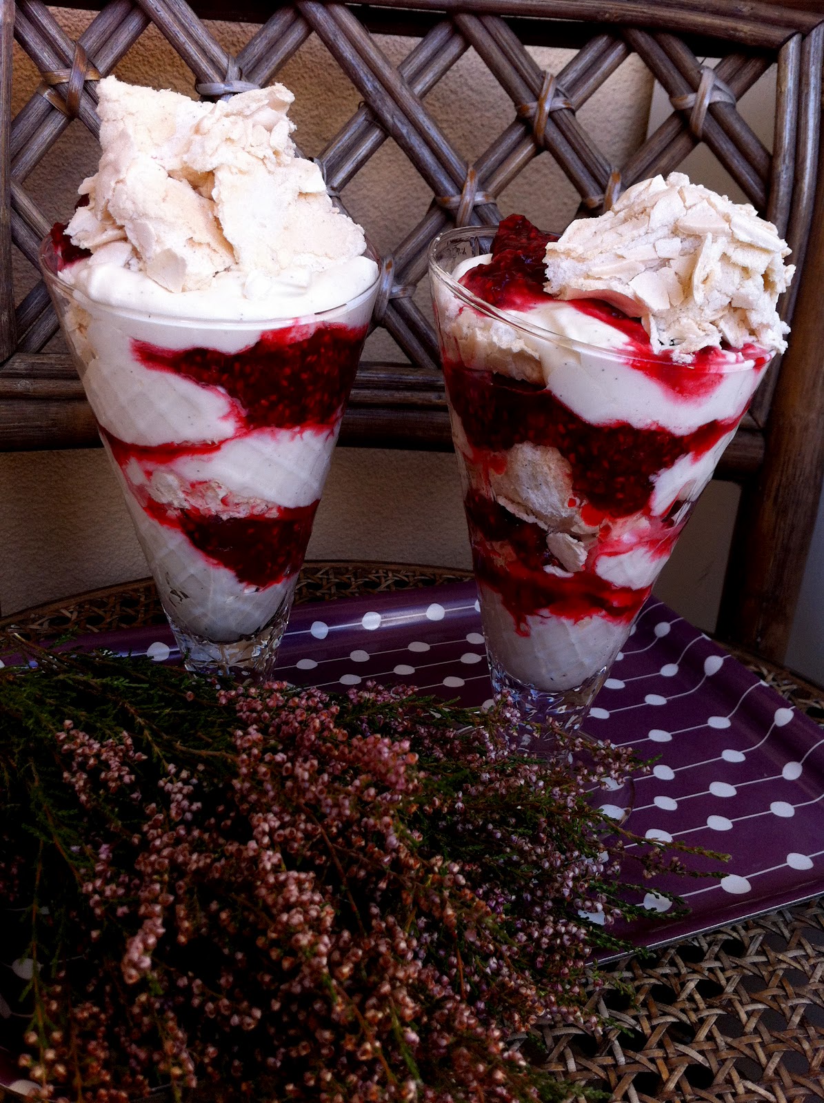 Ubić śmietanę, dodać krem bawarski i żelatynę (namoczone wcześniej płatki i rozpuszczone w kąpieli wodnej lub granulowaną rozpuszczoną w niewielkiej ilości wrzątku). Podzielić powstałą masę na połowę. Do jednej dodać mus z czarnej porzeczki, a do drugiej malinowy.