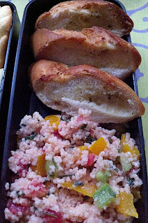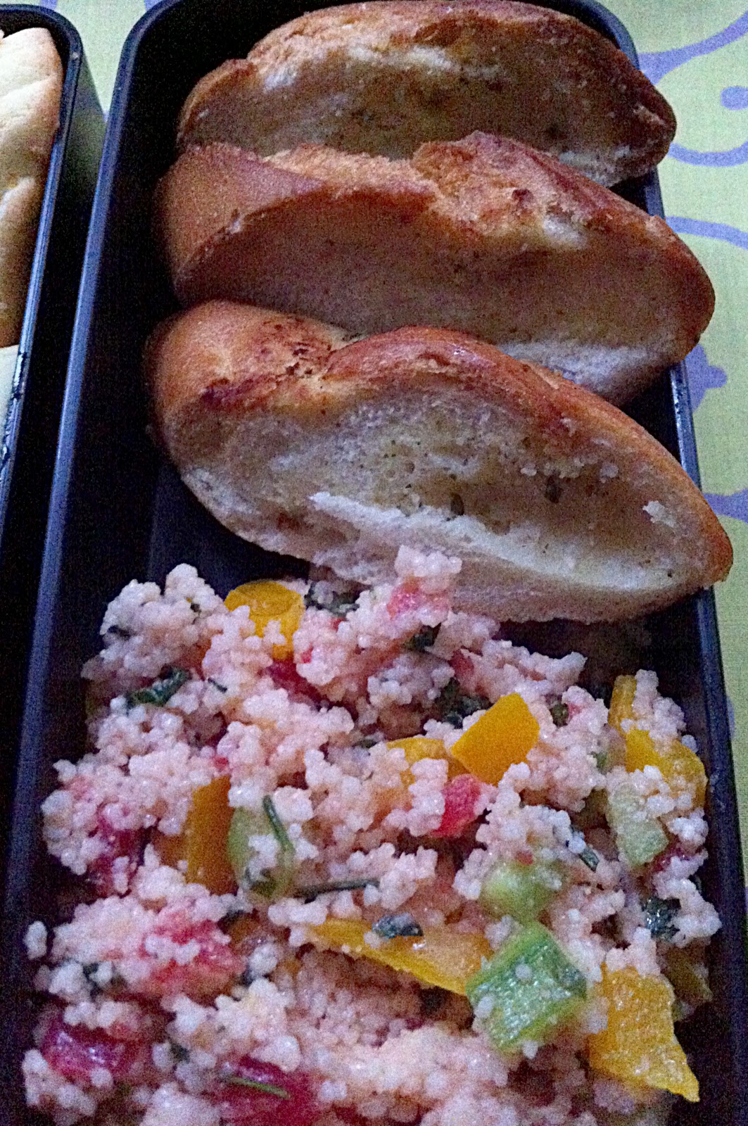Dzisiaj w pudełku znalazła się sałatka z kuskusa, papryki, zielonego ogórka, pomidora i kolendry oraz bagietka czosnkowa. W części deserowej magdalenki i soczysta gruszka.
