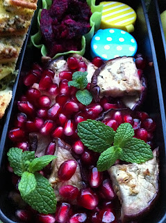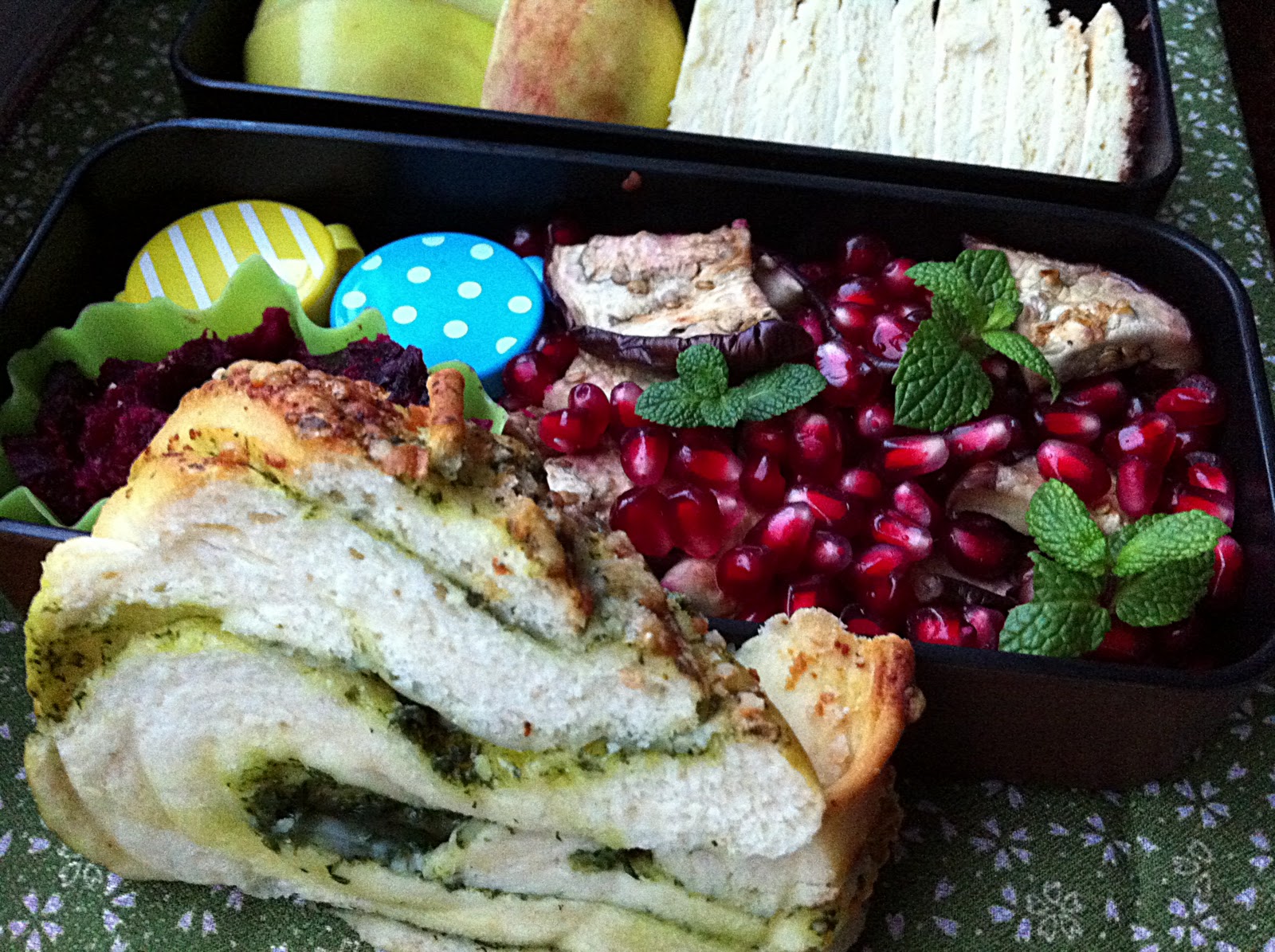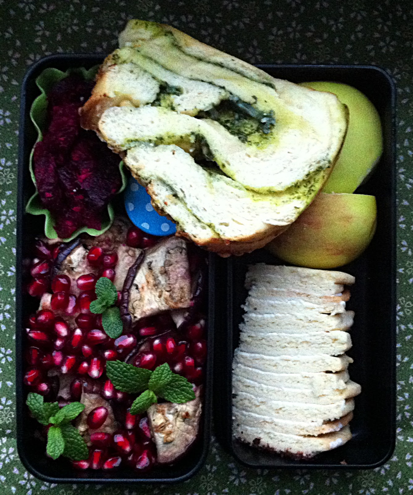 W dzisiejszym bento sałatka z grillowanego bakłażana z pestkami granatu i dressingiem miętowym (w pojemniczku), ćwikła oraz absolutnie bajeczny chlebek z bazyliowym pesto.