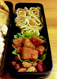Składniki na sałatkę:W dzisiejszym bento sałatka z kurczaka i ananasa z bagietką czosnkową, roladki z chlebka polarnego, wędzonego łososia, sałaty lodowej i sosu do łososia (pomysł IKEA), pitahaja i poziomki.