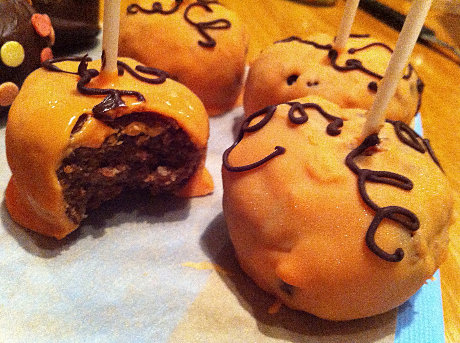 Czekoladę roztopić z 1 łyżką oleju w kąpieli wodnej. Patyczek zanurzyć w czekoladzie i włożyć w kulkę. Ułożyć cake pops na papierze patyczkami do góry i schłodzić przez około 15 minut. Następnie obtaczać w roztopionej czekoladzie, czekając aż nadmiar spłynie. Gotowe ciastka wbić w styropian lib poukładać patyczkami do góry.