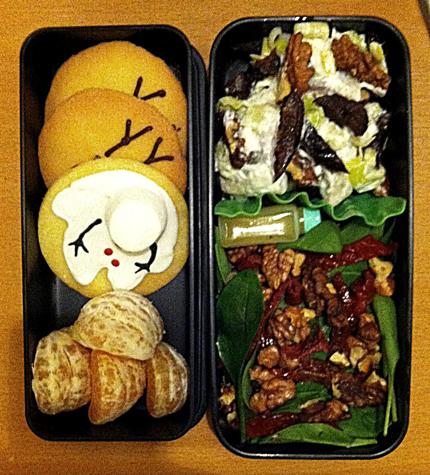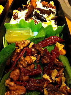 W dzisiejszym bento znalazły się śledzie z orzechami, porem i śliwką oraz sałatka z młodego szpinaku, suszonych pomidorów i orzechów włoskich z winegretem.