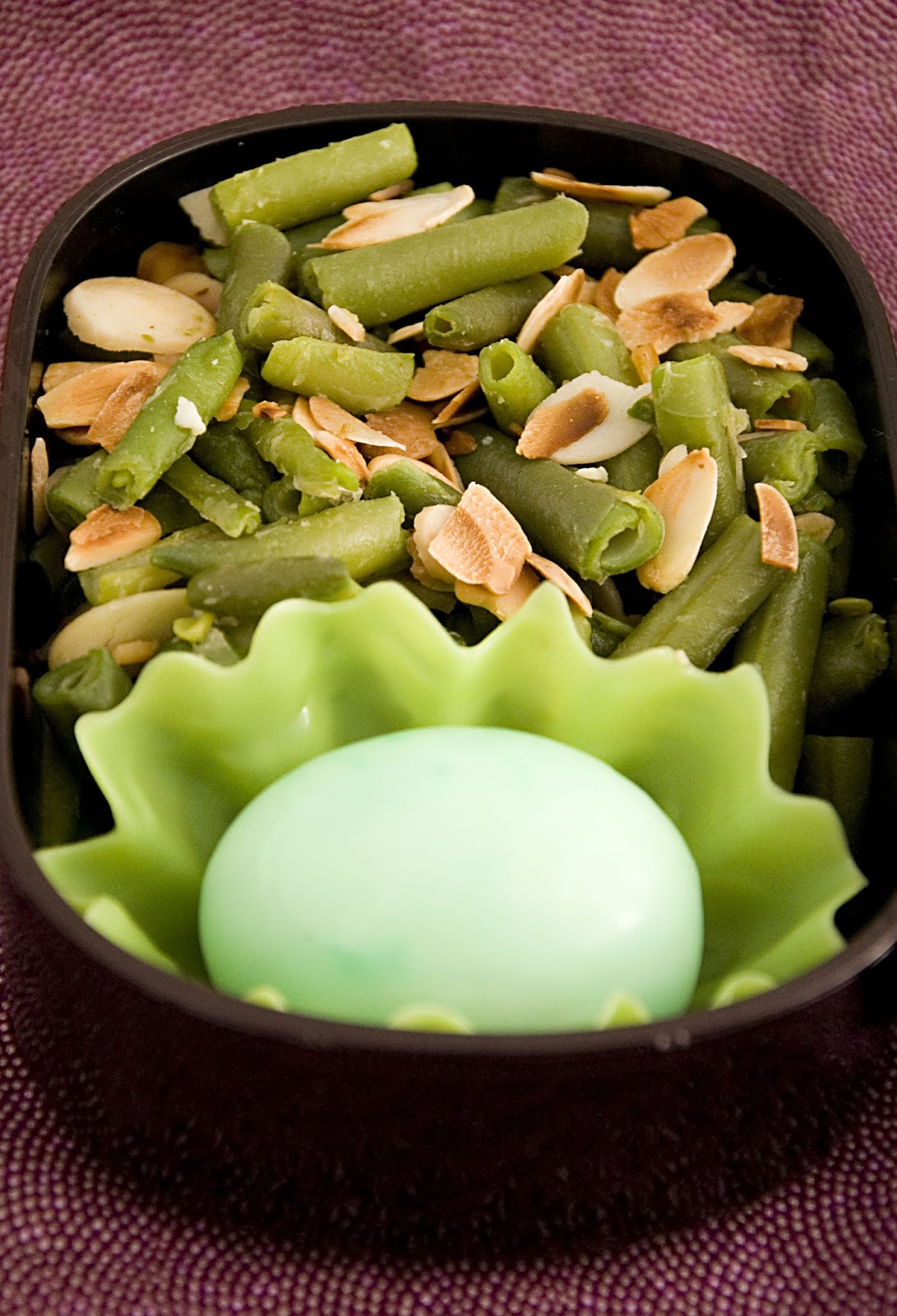 W części wytrawnej znalazła się sałatka z fasolki szparagowej z odrobiną czosnku i podsmażonymi płatkami migdałów oraz zielone (nie ze starości :-P) jajko.