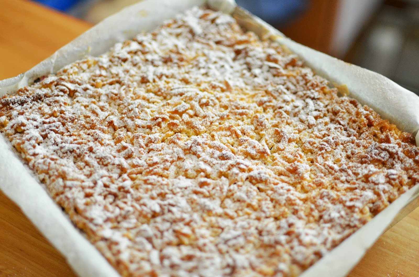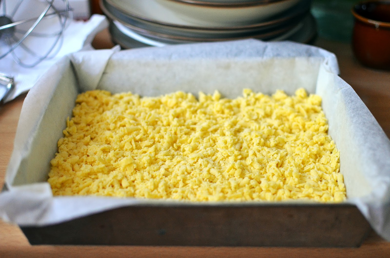 Blachę o wymiarach 33 x 20 cm wyłożyć papierem do pieczenia. Na spód zetrzeć na tarce większą część ciasta i wyrównać dłonią (ciasto można wyciągnąć 10 minut wcześniej z zamrażarki, będzie łatwiej ścierać).