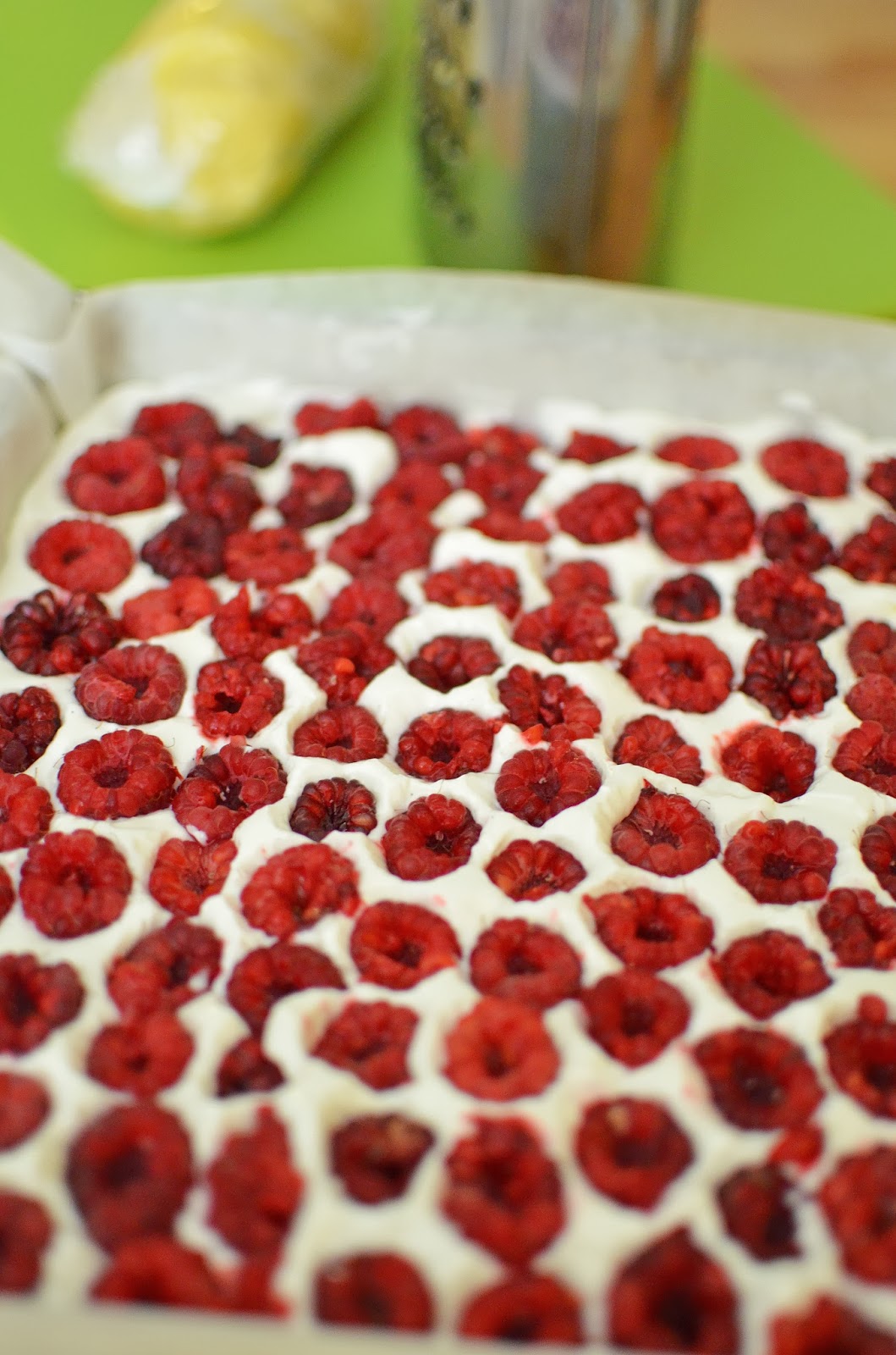 budyniową pianę, wyrównać. Ułożyć gęsto maliny (otworkami