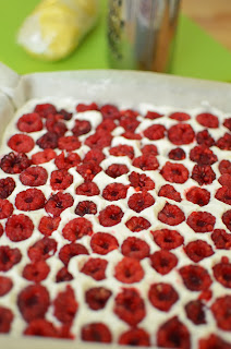 budyniową pianę, wyrównać. Ułożyć gęsto maliny (otworkami