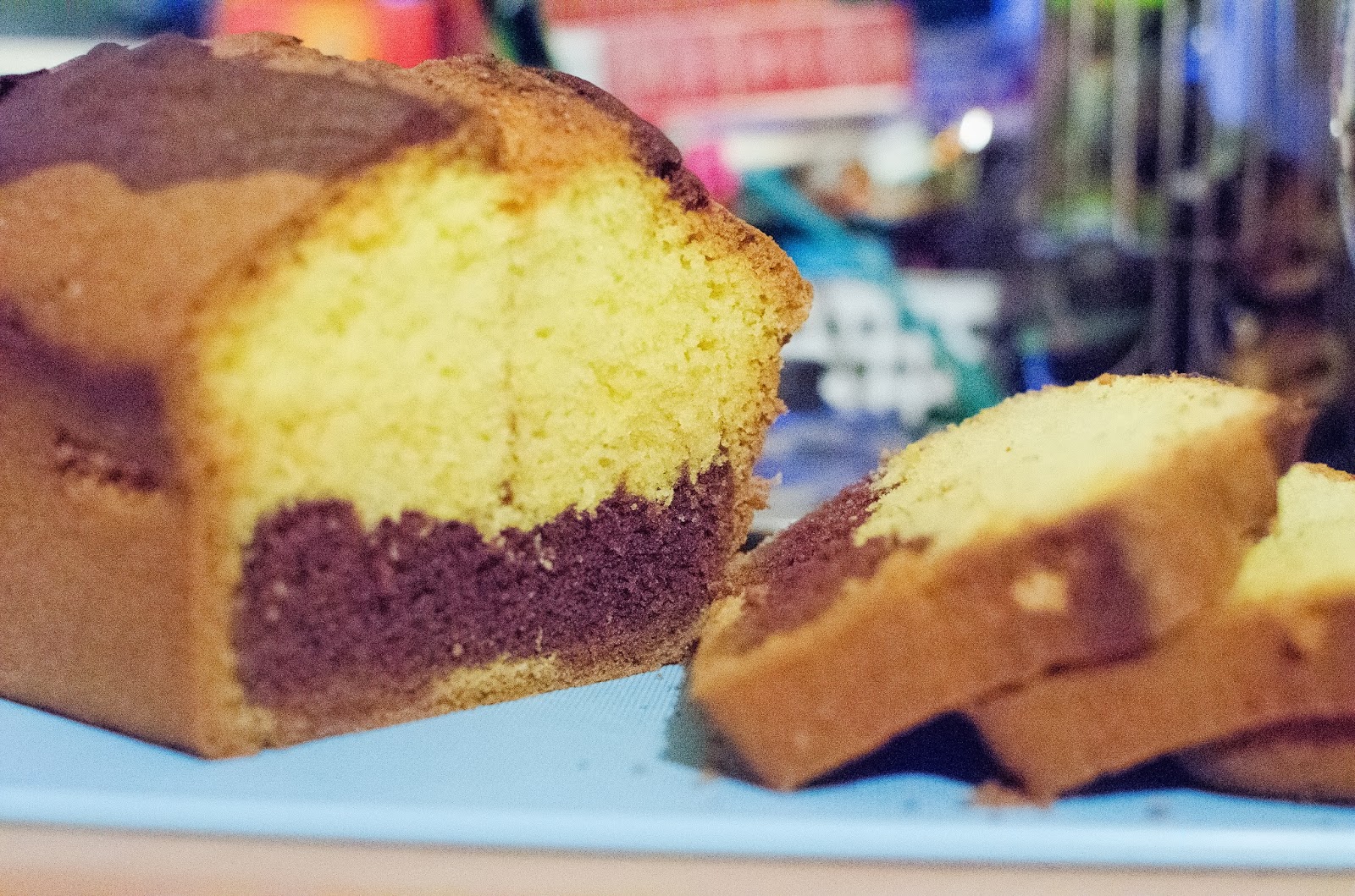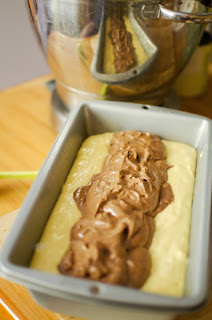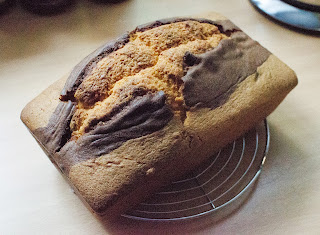 3/4 ciasta wyłożyć do wysmarowanej tłuszczem keksówki (10 x 20 cm). Do reszty ciasta dodać przesiane kakao i wymieszać. Ciemną część wyłożyć na środek na całej długości blachy.