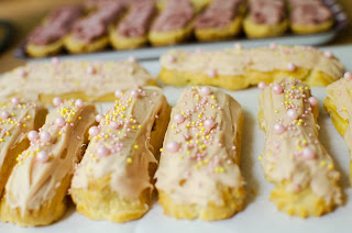 Rozpuścić białą czekoladę w kąpieli wodnej. Dodać odrobinę różowego lub czerwonego barwnika (najlepiej specjalnego do czekolady lub w proszku). Wieczka eklerków dekorować białą czekoladą (robiłam to małą silikonową szpatułką) i ewentualnie posypkami. Pozostawić do zastygnięcia.