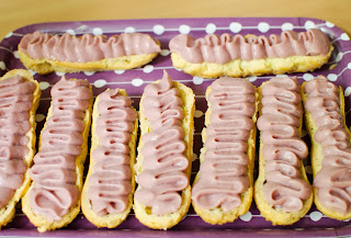 Wystudzone eklerki przekroić. Nałożyć budyń na denka eklerków. Najłatwiej jest to zrobić rękawem cukierniczym.
